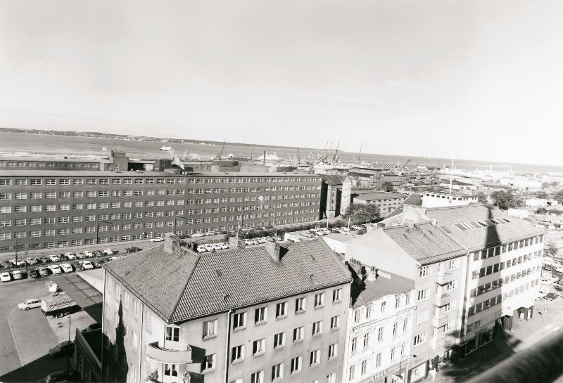 Bilden visar en panorama över ett bostads- och industriområde vid hamnterminalen i Helsingborg, år 1970. På bilden syns flera fastigheter med butiker på bottenvåningen, som till exempel: "Bildeve", "Esso", "Shell", mm. Bakom fastigheterna syns en del av gamla gummifabriken. Längst i bakgrunden syns hamnen, med båtar och lyftkranar.