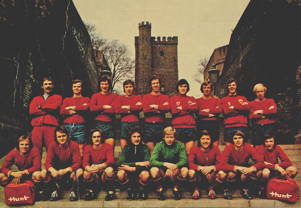 Vykort föreställande Helsingborgs IF sittandes på Terrasstrapporna med Kärnan i bakgrunden. Vykortet fungerade även som en lottsedel med flera olika vinstalternativ.