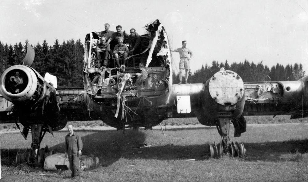 Fotografi av en tysk flygkyrkogård. På ett paln som halverats sitter och står sju män.