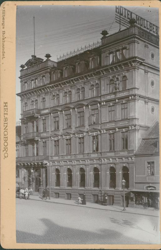Fotot visar Hotell Mollberg fotograferat från Stortorget. I det lilla huset vägg i vägg på hotellets västra sida syns en butik, till synes en herrekipering vid namn Viktor Schult. Utanför ekiperingen på det gatstensbelagda Stortorget ser man skuggan av Kandelabern, gatlyktan. På trottoaren går några personer, bland annat en kvinna med ett barn. Utanför hotellets huvudentré väntar en hästdroska med hästar i par.