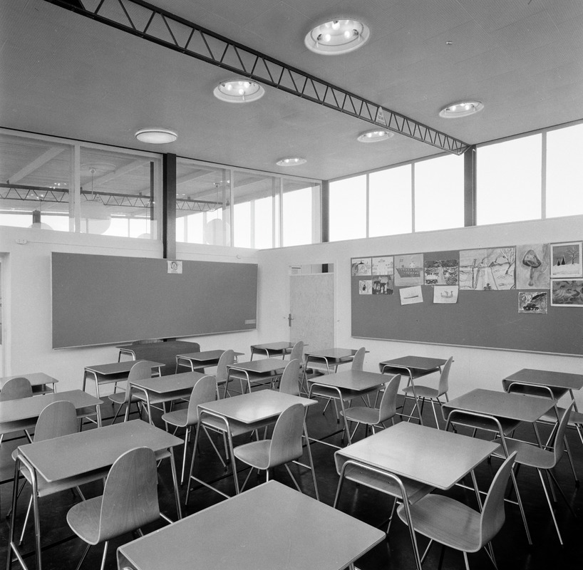 Bilden föreställer en sal med skolbänkar. På en av de båda väggarna en anslagstavla med fotografier. På den andra väggen en griffeltavla.