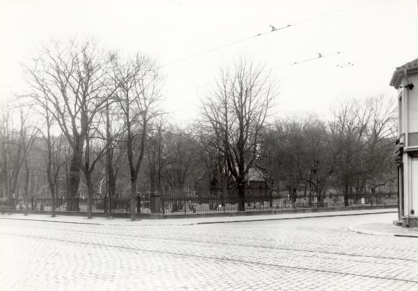 Svartvitt fotografi, föreställande korsningen Eneborgsgatan-Södergatan. Till höger syns Södergatan 5 i kv. Belgien, kyrkogården hör till kv. Bastionen.