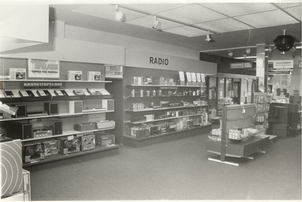 Fotografi som avbildar insidan av Hefomas affär på Stortorget 16. Här ser vi Radio avdelningen. Bilden är tagen på 1970-talet.