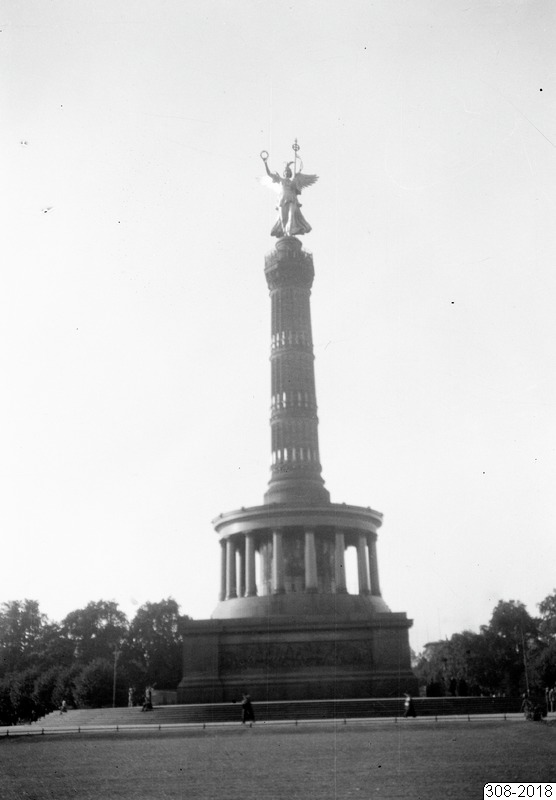 Bilden föreställer minnesmärket Siegessäule i Berlin. Siegessäule (tyska för Segerkolonnen) är ett minnesmärke i Großer Stern i stadsparken Tiergarten i Berlin och en av Berlins främsta turistattraktioner samt sevärdheter. Längst upp finns en utsiktsplattform under Victoriastatyn. I bakgrunden på marken står träd.