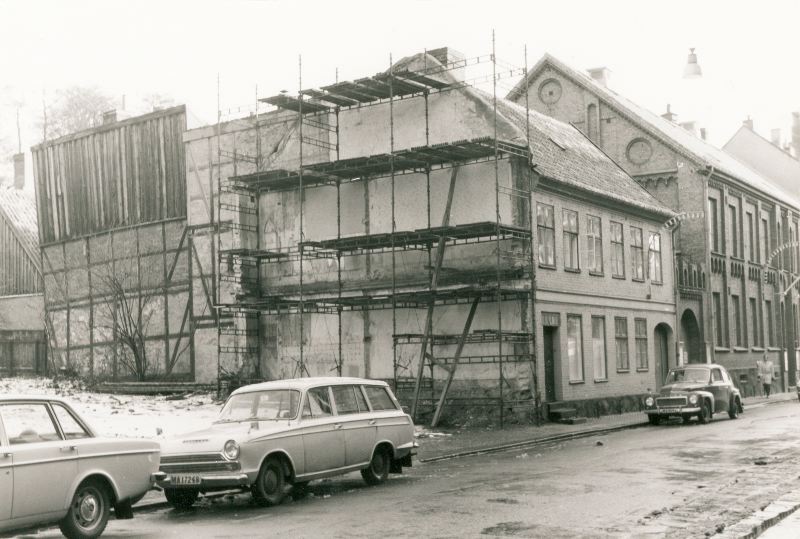Bilden visar reparationen av gaveln på byggnaden mot Södra Storgatan 27. Vid gavelns vägg är en byggställning rest. Till vänster syns en flygelbyggnad. Till höger syns byggnadens gatufasad och på gatan står några parkerade bilar.