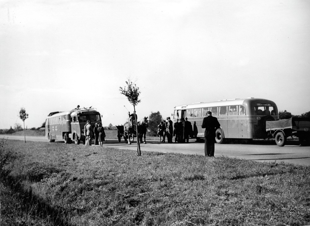 Fotografi av hur två Linjebussar möts på en landsväg. Mellan bussarna kör en häst och vagn. Passagerarena står utanför bussarna.