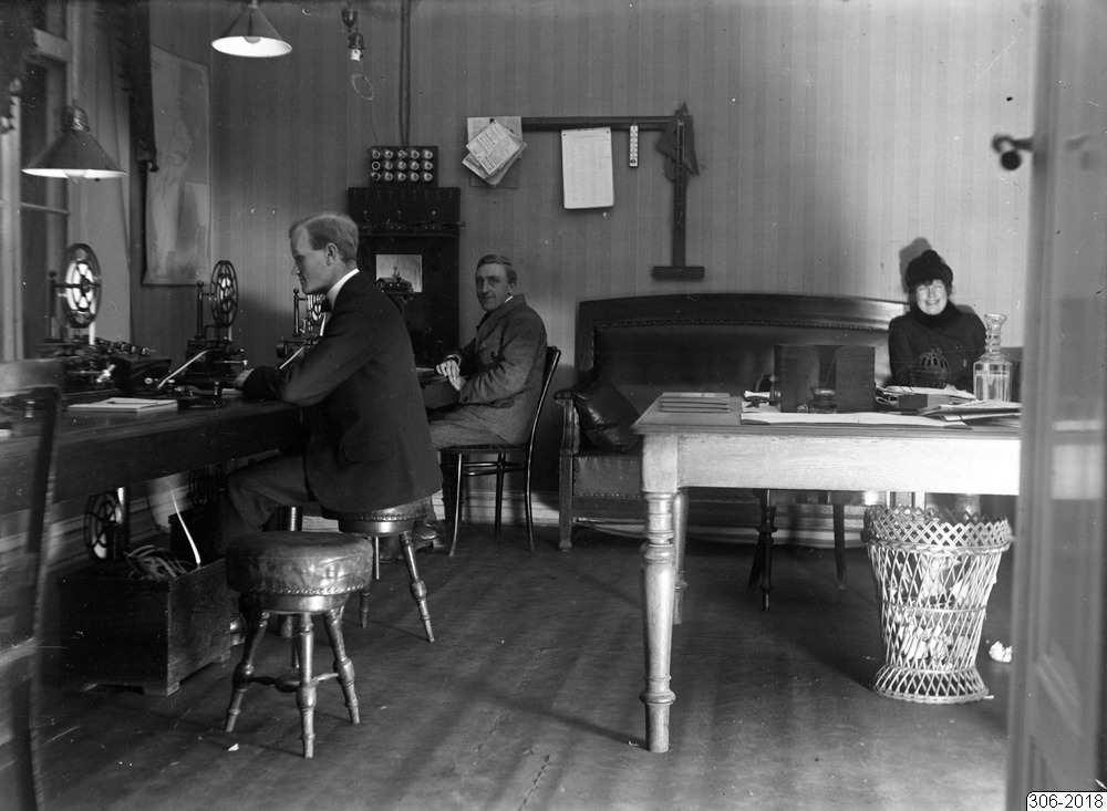 Bilden föreställer ett rum på en telegrafstation. I rummet finns två oilika bord med telegrafiutrustning. Där finns också en stol, pallar samt soffa. Under ett bord står en papperskorg. I rummet sitter två män och en kvinna. På väggen i bakgrunden hänger utrustning, telefonkatalog? och en panel med glödlampor.