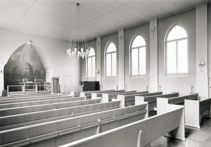 Bilden visar Baptistförsamlings kyrkointeriör mot ingången till salen. På bilden syns altartavlan i form av en väggmålning och belysningen ovanpå samt altarbordet och altarskåpet. Bilden visar också ett piano, kyrkobänkar, fönster med arkader, vägglampor och i mitten av kyrkan en takkrona.