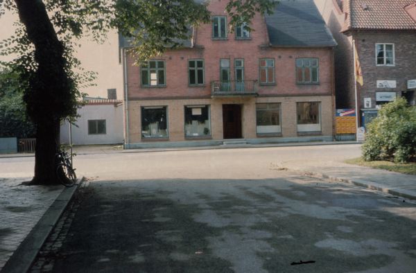 gatumiljö i Höganäs, över gatan ligger en tobakshandel. Utanför på väggen sitter Kvällspostens (Kvp) gula löpsedelstavlor.