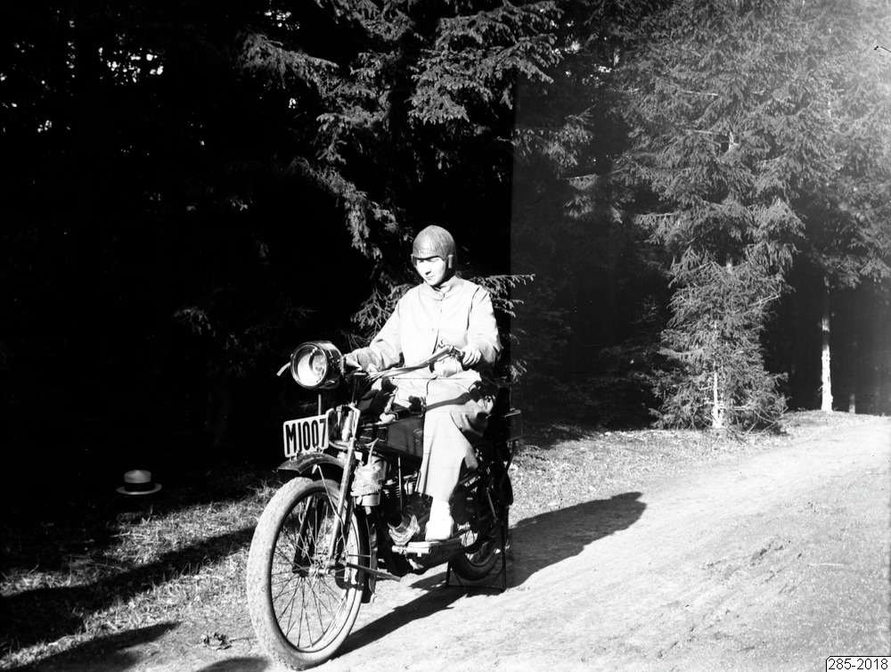 Bilden föreställer en man sittandes på en motocykel på en väg. I bakgrunden skog, på marken ligger en hatt.