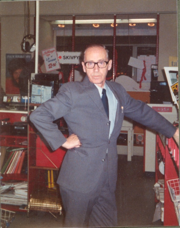 Fotografi som avbildar Eric Lindblad. Eric jobbade på Hefoma under många år. Bilden är troligen tagen på Hefomas affär på Stortorget 16. När bilden är tagen är okänt men troligen på 70-talet.