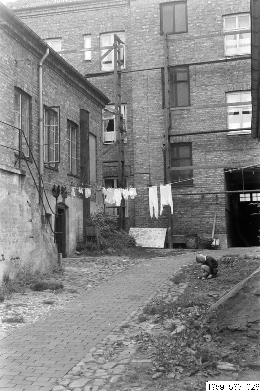 Bilden föreställer en stadsmiljö. I förgrunden en delvis stenlagd innergård. I bakgrunden två och treplanshus i vinkel. En lina med tvätt hänger över gården.