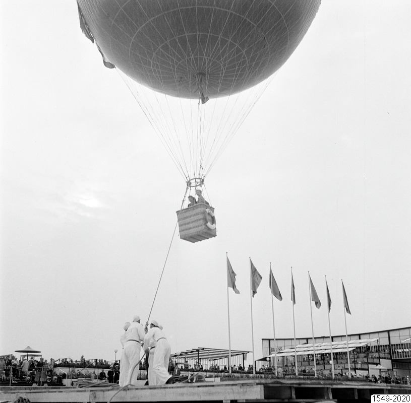 Bilden föreställer en luftballong på väg att lyfta. I korgen syns två personer. tre personer står på marken. I bakgrunden flaggor och paviljonger.