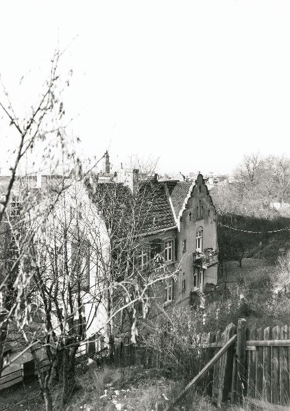 Till vänster syns en byggnad med balkonger. Parallellt med bostäderna, i sluttande plan ligger en trädgård kringgärdad av ett staket. Längst i bakgrunden syns rådhustornet.
