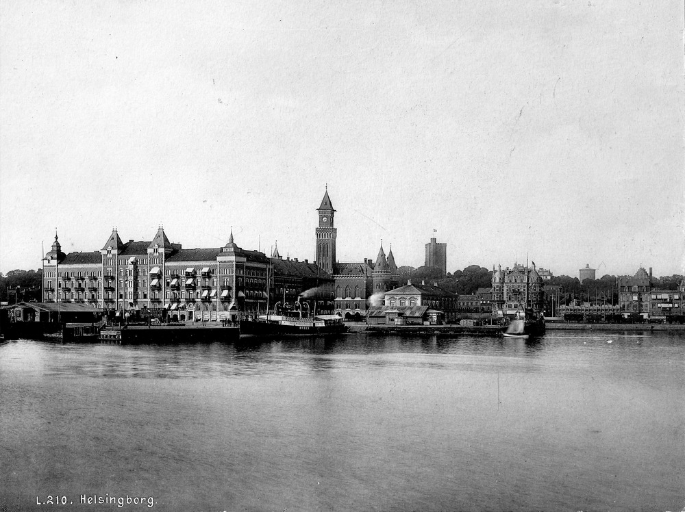 Vy över Helsingborg från sundet. På bilden syns bland annat Rådhuset, Gamla Tullhuset och Kärnan.