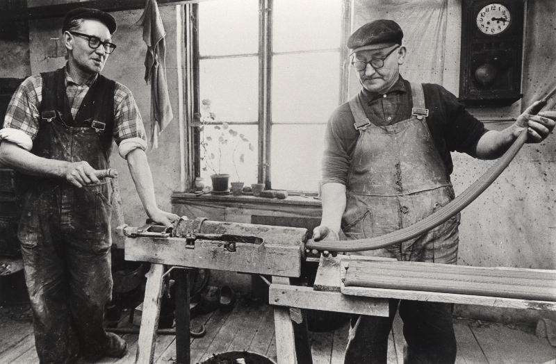fotografi, Hugo Anderberg och Olof Nilsson, Raus vid smörpressen i färd med att pressa ut refflade stänger, som sedan kapas och bränns för att användas som mellanlägg mellan kärlen vid bränningen. 1970-t.