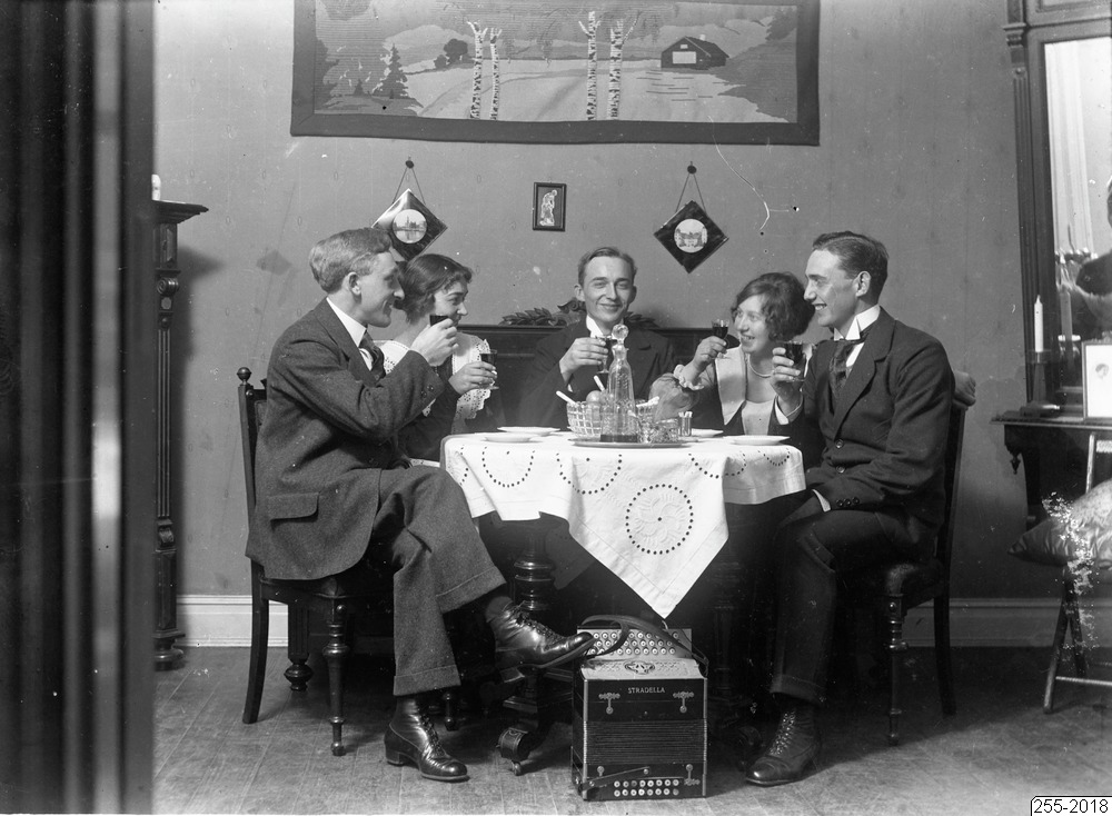 Bilden föreställer två kvinnor och tre män sittandes vid ett matbord i ett vardagsrum. På bordet en duk, en karaff och en fruktskål. Personerna håller i varsitt glas som i en skål situation. På väggen bakom del av en tavla. I förgrunden under bordet står ett dragspel.