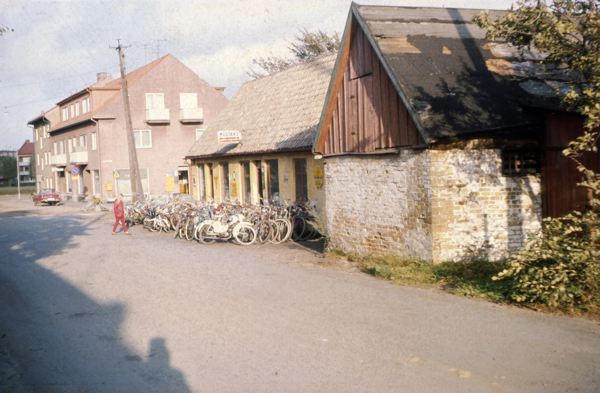 gatumiljö i Höganäs, cyckelaffären Knutssons cyklar. Med skyltning för märket Mustang.