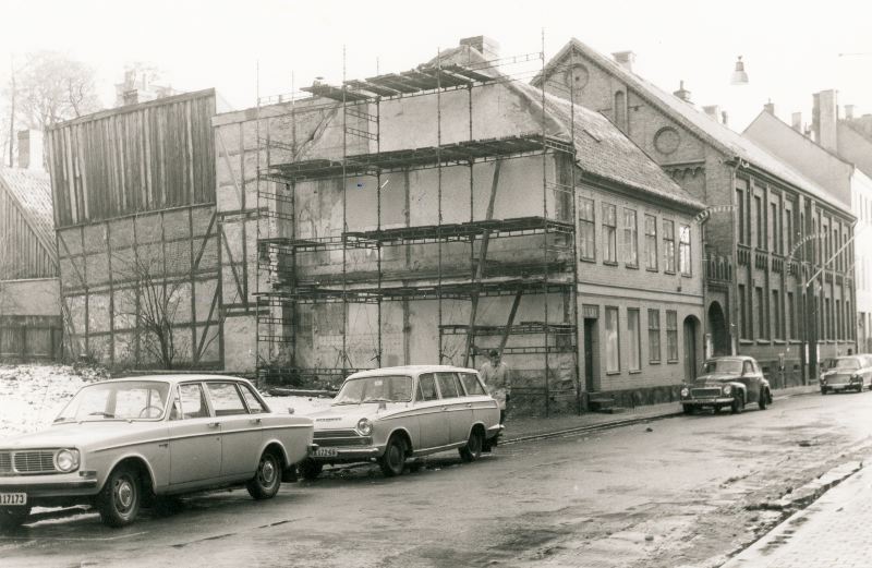 Bilden visar reparationen av gaveln till huset på Södra Storgatan 27. På bilden syns byggnadens gavel med en byggställning rest intill. Till höger syns byggnadens gatufasad. Vid byggnadens trottoar syns parkerade bilar.