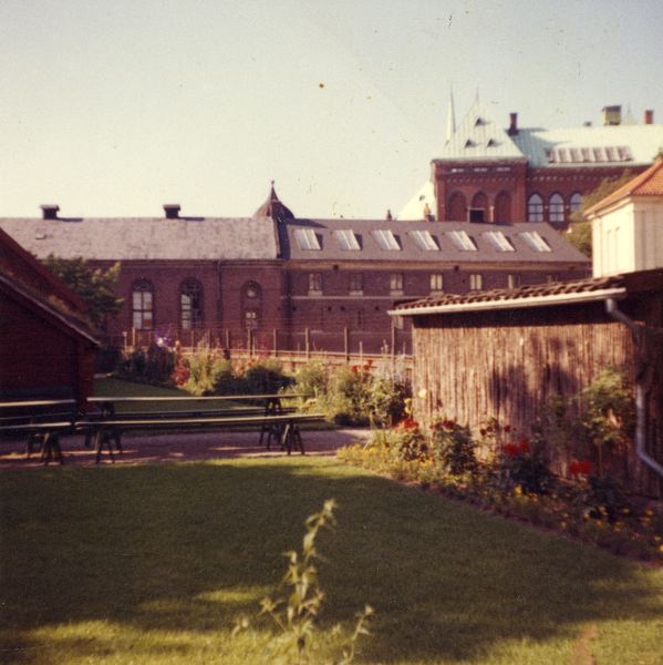 Fotografi på de vackra rabatterna på Möllebacken med vy mot Nicolajskolan.