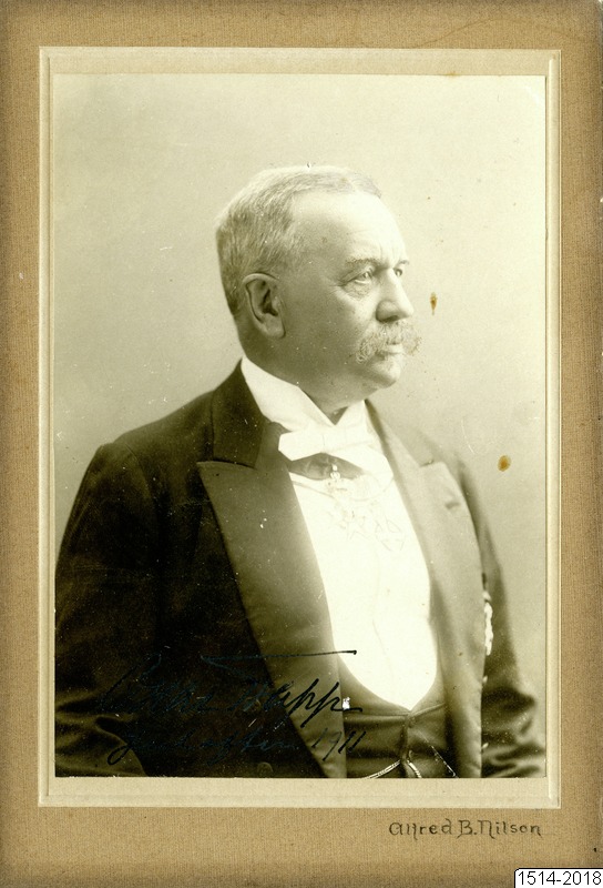 Porträtt av Oscar Trapp i högtidsdräkt med dekorationer. Foto på kartong