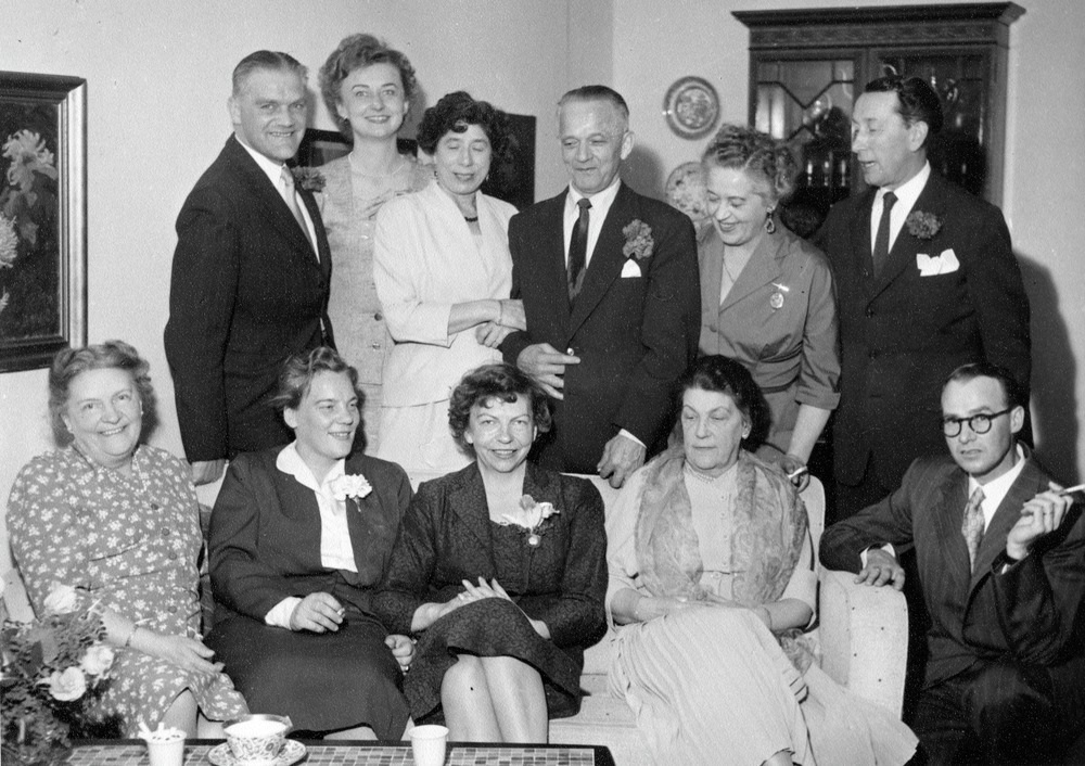 Grupporträtt av män och kvinnor. Flera av dem har nejlikor på kavajslaget elelr dräkten.