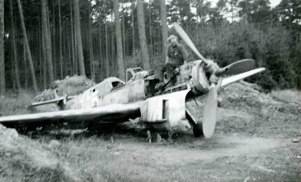 Fotografi av en tysk flygkyrkogård. På ett av planen sitter en man.