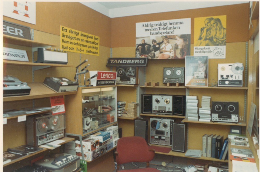 Färgfotografi från 1970-tal som troligen avbildar insidan av Hefomas affär på Stortorget 16. Här ett rum med elektronik som bandspelare, högtalare, mikrofoner, och en disk till höger.