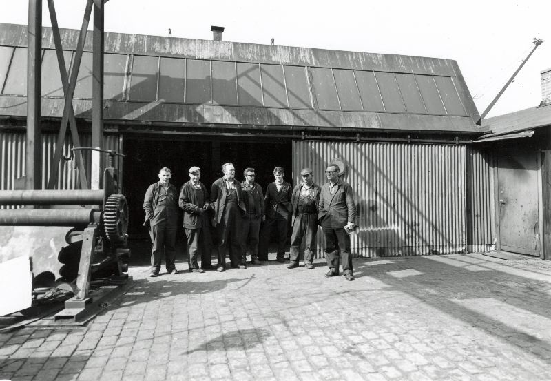 Bild av av ett arbetslag på Kranverkstadens gård i Helsingborgs hamn,denna bild visar Kranverkstadens, södra, västra intill varvet.