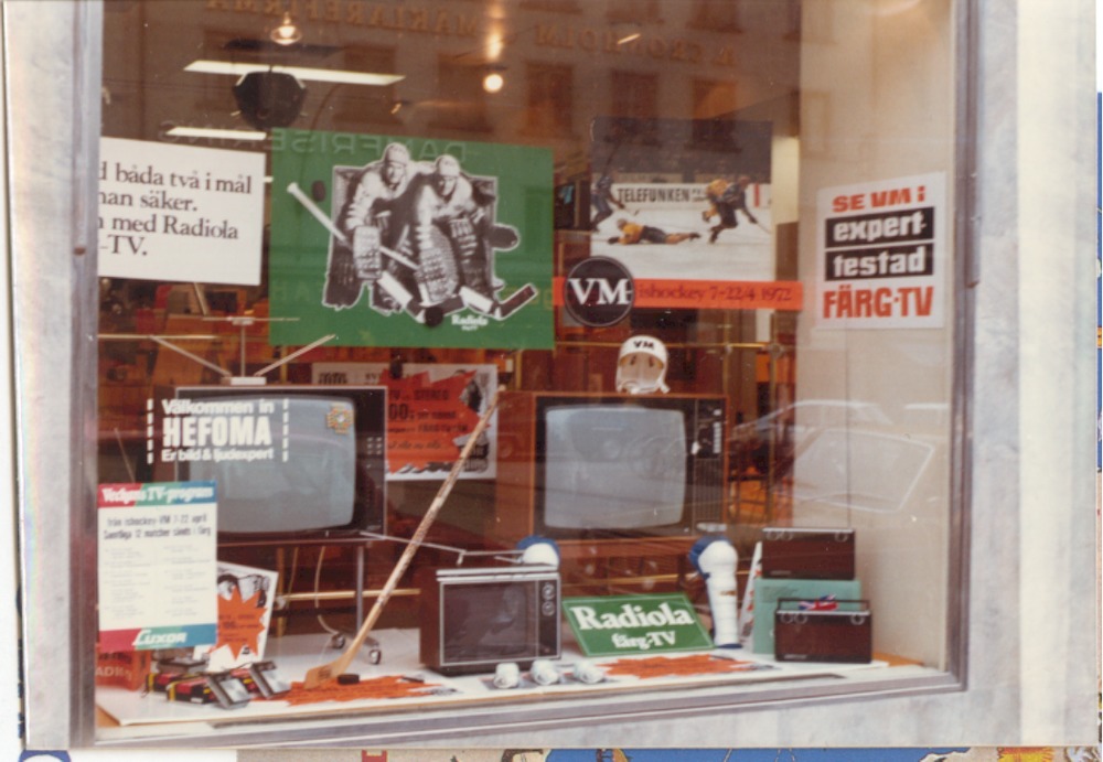 Fotografi som avbildar ett skyltfönster i Hefomas affär på Stortorget 16, i fönstret ser vi reklam för Ishockey VM 1972 tillsammans med televisionsapparater. Bilden är tagen på 1970-talet.