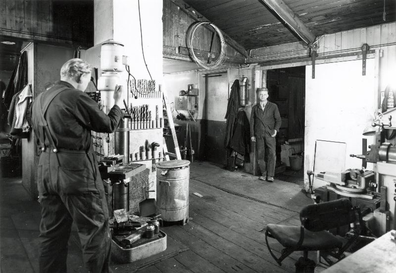 Bild av av två arbetare som står och arbetar i en verkstad, Kranverkstadens södra, västra intill varvet, i Helsingborgs hamn.