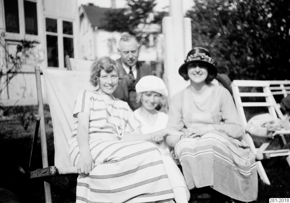 Bilden föreställer fyra personer sittande och stående i en trädgård framför en husfasad. Där är två typer av trädgårdsstolar. I bakgrunden till höger växtlighet.