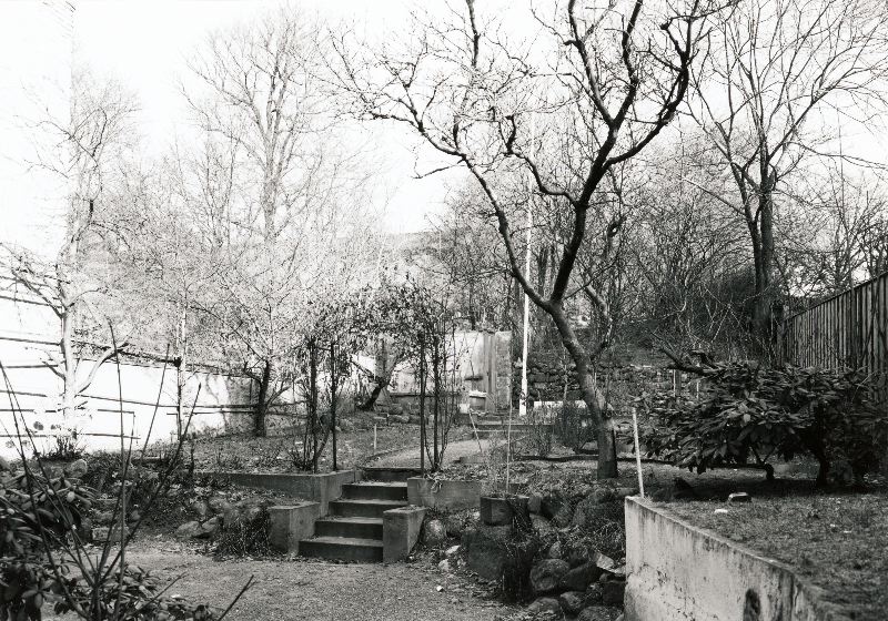 Bilden visar trädgården uppbyggd i flera nivåer delad av trappor bakom gårdshuset på Södra Storgatan 11. Gården har träd, buskar, blomrabatt och blomarrangemang. Trappan som främst syns på bilden har en spaljé för blommor. Till höger syns en flaggstång och i bakgrunden en mur av stenar.
