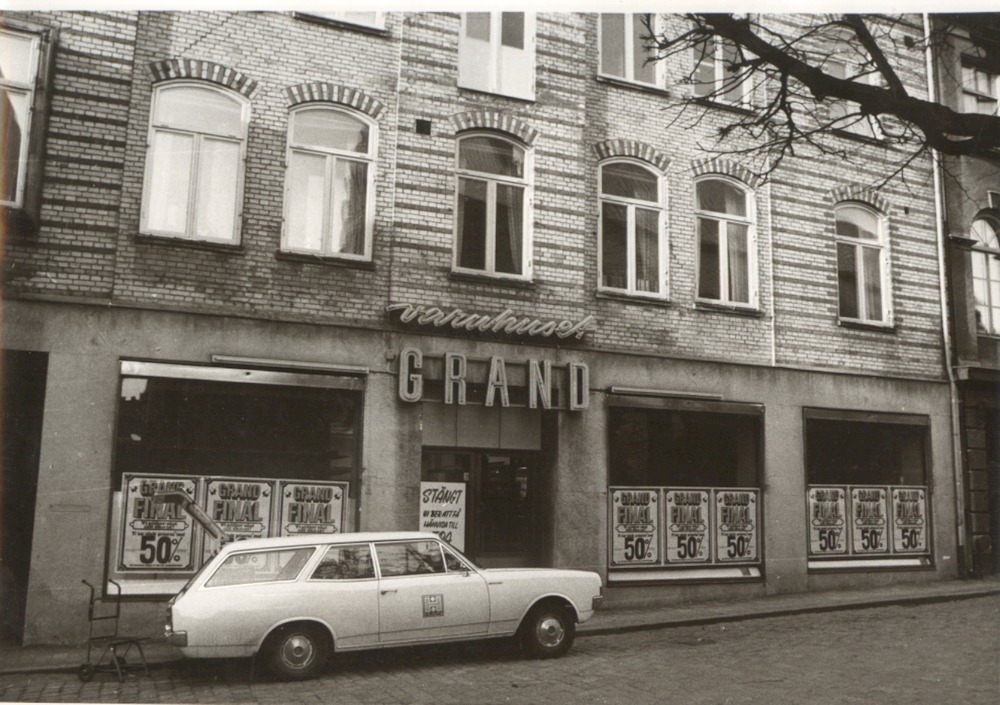 Fotografi som avbildar utsidan av varuhuset Grand och vad som kommer bli Hefomas affär på Stortorget 16 under 1970-talet. Här ser vi fasaden mot Mariakyrkan.