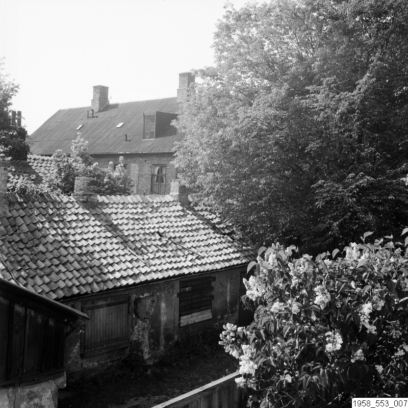 Bilden föreställer en stadsmiljö. I förgrunden tegltak och trädkronor. I bakgrunden flerfamiljshus.