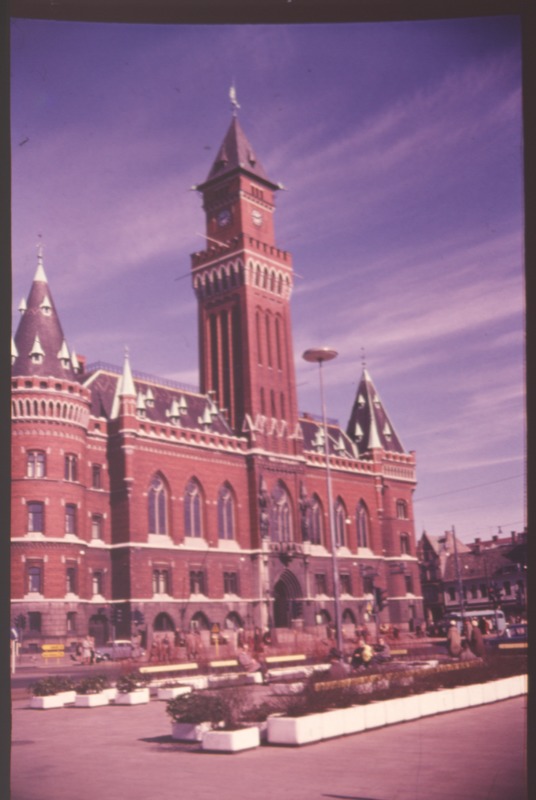 Färgfotografi som avbildar Helsingborgs rådhus. Daterad till 1970-09-04, men datering är osäker då det verkar fortfarande vara vänstertrafik. Se även DIG_2020_938 till och med DIG_2020_945.