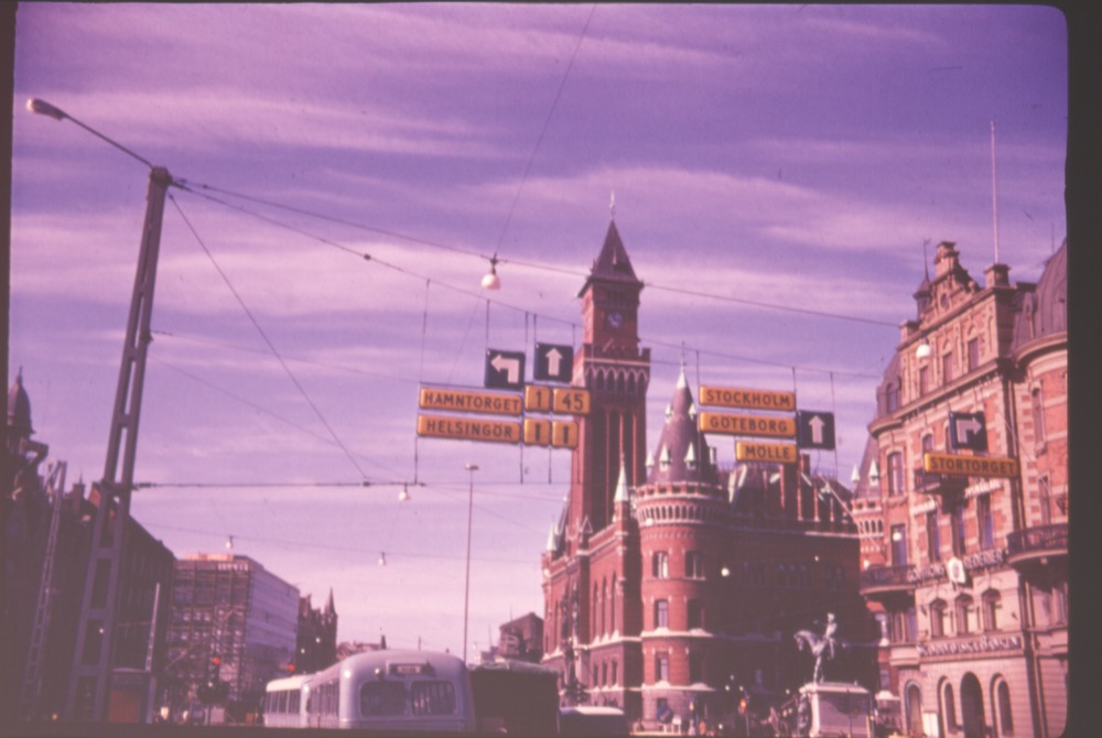 Färgfotografi som avbildar Helsingborgs Järnvägsgatan och Rådhuset. Daterad till 1970-09-04, men datering är osäker då det verkar fortfarande vara vänstertrafik. Se även DIG_2020_937 till och med DIG_2020_945.