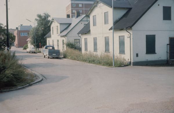 gatumiljö i Höganäs, bilden är tagen i kvarteret bakom Höganäs höghus (EPA-huset). Man ser att den närmaste villan är obebod och att fönstren är igensatta.
