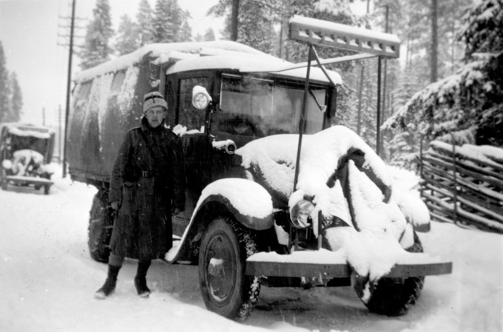 Fotografi av militär framför lastbil. Bilen är delvis täckt av snö.