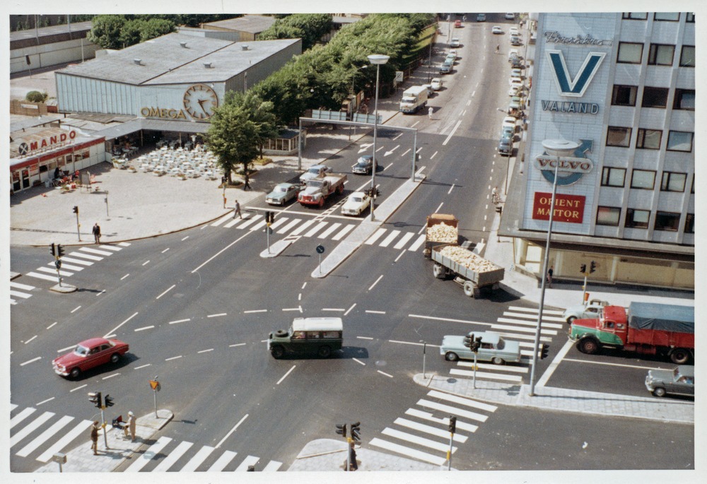 En fyrvägskorsning med trafilkjus och övergångsställe i fågelperspektiv. I korsningen kör bilar samt en lastbil. I kanterna skymtar byggnader. Till vänster en uteservering