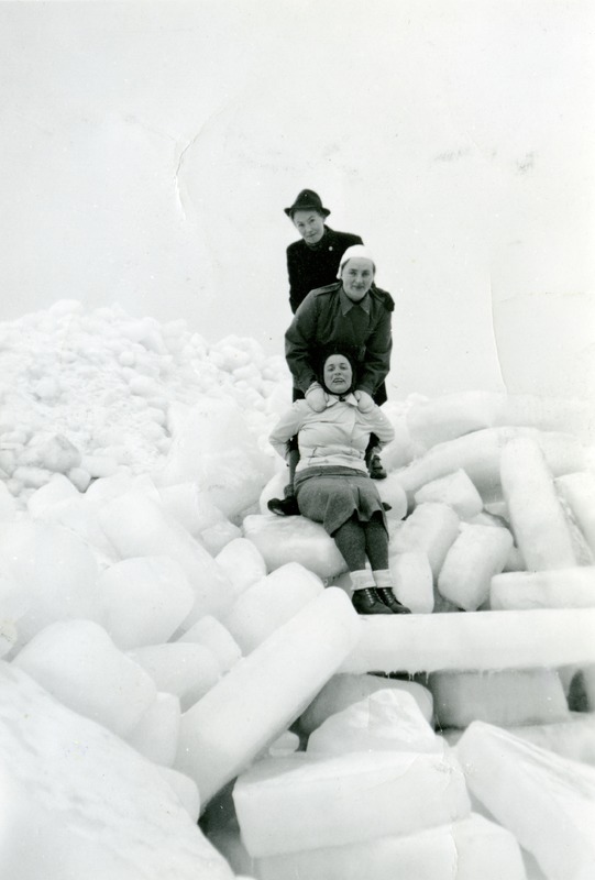 En grupp människor poserar på isvallar utanför Helsingborg vintern 1939-40.