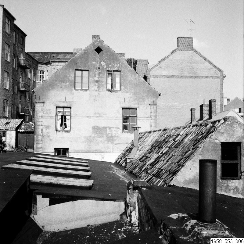 Bilden föreställer en stadsmiljö. I förgrunden tak av olika slag, tegel och annat. I bakgrunden flerfamiljs hus.