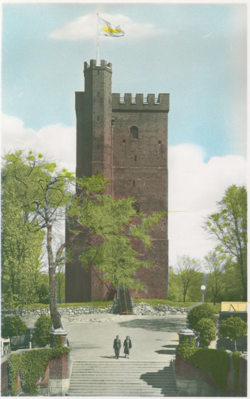 Vykort föreställande Kärnan och terrasstrapporna. I trappan, på väg ner, går två personer. Kortet är handkolorerat.