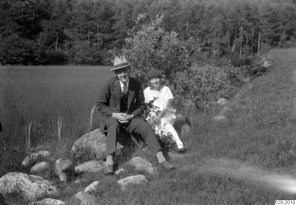 Bilden föreställer en kvinna och en man sittande bland stora stenar vid kanten på en damm. I bakgrunden skog.