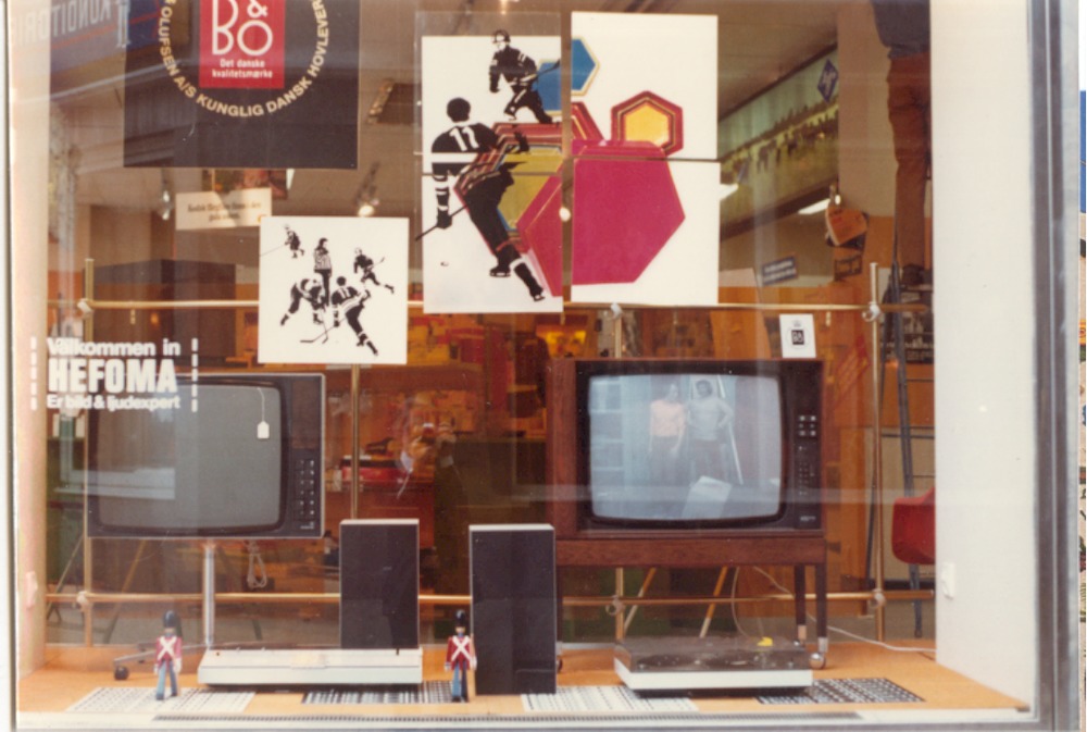 Fotografi som avbildar ett skyltfönster i Hefomas affär på Stortorget 16, i fönstret ser vi reklam för ishockey och televisionsapparater. Bilden är tagen på 1970-talet.