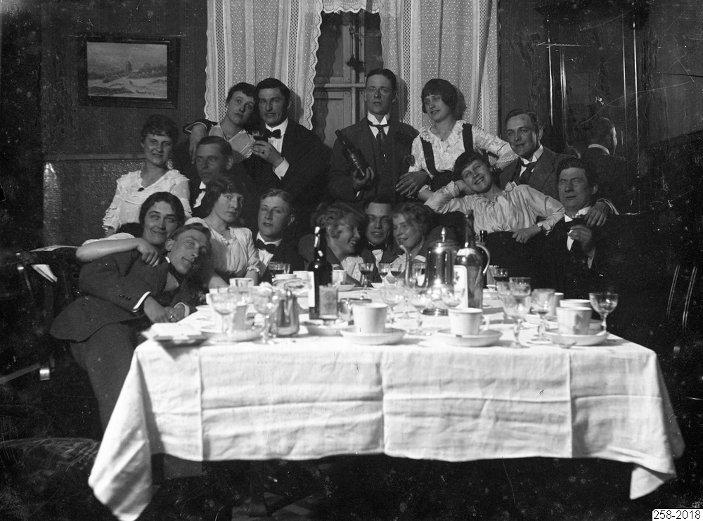Bilden föreställer 16 personer, kvinnor och män som står och sitter bakom ett matbord. I bakgrunden en spegel, ett fönster med gardiner samt en vägg med en tavla. På bordet ligger en duk. På bordet står vinglas och koppar med fat samt någon kanna.