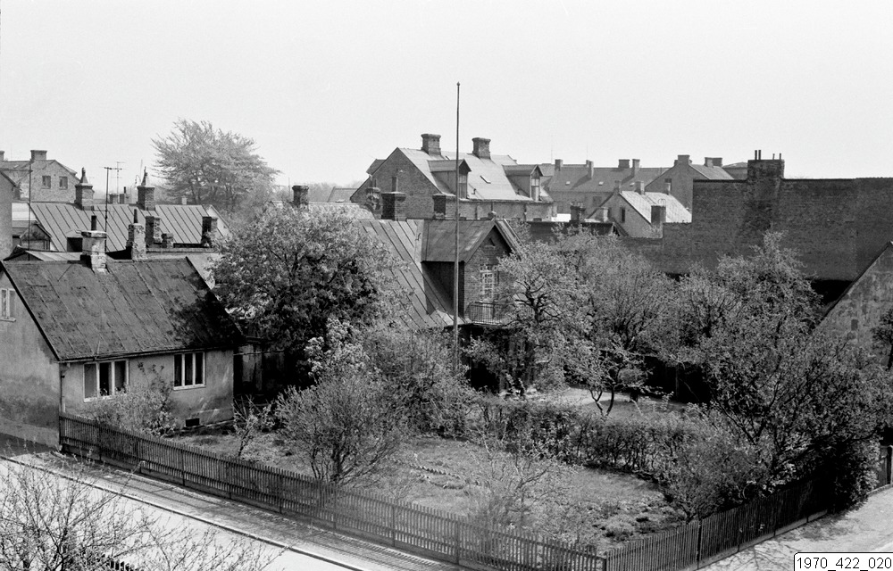 Vy över gamla Stattena, med bebygelse som rivits i Kv. Skomakaren.