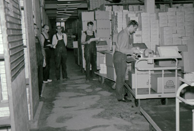 Tretorn, magasinet. Fem lagerarbetare varav fyra i tidstypiska "snickar-byxor".