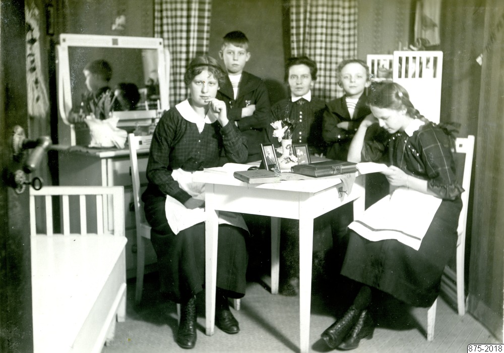 Familjen Kronholm (utom fadern) sitter runt ett bord i familjens lägenhet på Karl Krooksgatan 50 i Helsingborg.