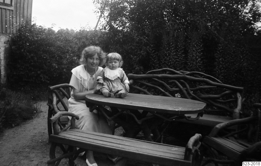 Bilden föreställer en kvinna i en trädgård. Kvinnan sitter i en trädgårdssossa vid ett bord och framför henne på bordet sitter ett litet barn. I förgrunden en bänk och i bakgrunden buskar.